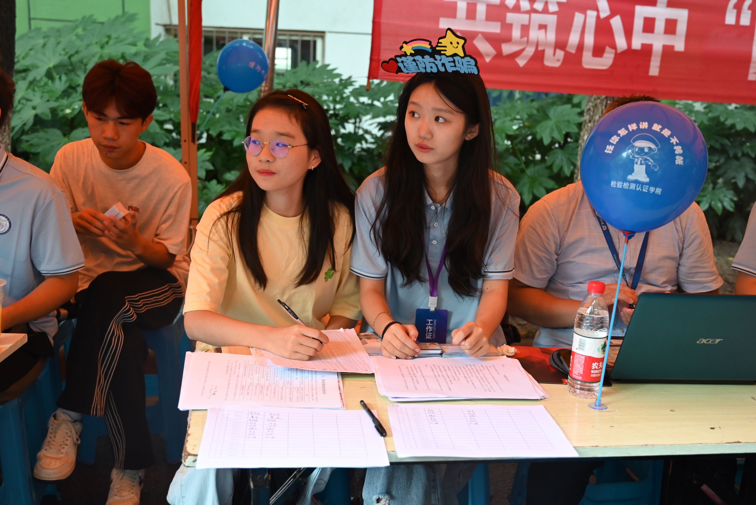 在新生报到期间,学院坚守安全教育第一阵地。特别设置了“迎新反诈摊位”,摆放了反诈宣传展板和宣传物品,这些醒目的标志和实用的信息让新同学们能够一目了然地理解到提高安全意识的重要性。此外,摊位上还制作了特别的“谨防诈骗”发箍,并让每个班级的助理都佩戴,同时在每个班级报道桌子前都放置了防诈宣传气球。这些举措都为预防诈骗提供了积极的支持。