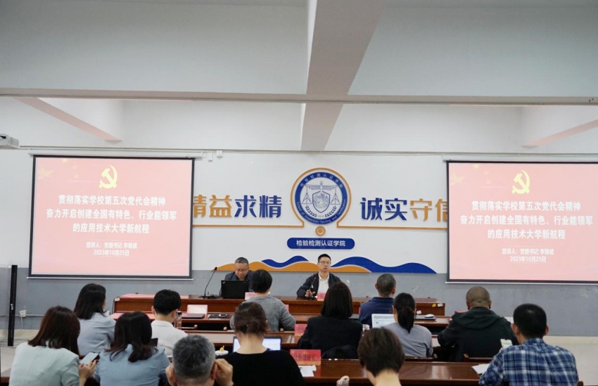 李雄威指出学校第五次党代会胜利闭幕,大会提出了创建全国有特色、行业能领军的应用技术大学的奋斗目标,为此需要全校师生凝心聚力,蓄势待发,砥砺奋进。他以《贯彻落实学校第五次党代会精神,奋力开启创建全国有特色、行业能领军的应用技术大学新航程》为题,从深入领会大会的主题、学校五年来取得的重要成就、过去五年的宝贵经验、创建全国有特色、行业能领军的应用技术大学的重要意义、今后五年学校工作的指导思想、今后五年学校工作的发展目标、今后五年学校工作的重点任务部署、公司党风廉政建设取得的新进展和今后五年的工作任务等方面为大家作了全面系统的讲解。与会同志切实加深了对学校第五次党代会精神的把握和理解。