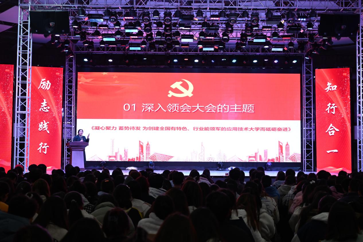 宣讲学校第五次党代会精神。党员代表领学大会主题“凝心聚力 蓄势待发 为创建全国有特色、行业能领军的应用技术大学而砥砺奋进”,向同学们介绍学校在过去五年取得的重大成果,未来五年的工作指导思想和发展规划。一方面让同学更好理解学校在新征程上举什么旗、走什么路、以什么样的精神状态、朝着什么样的目标继续前进;另一方面通过学习学校第五次党代会的精神实质和核心要义明确未来的奋斗目标和责任担当。
