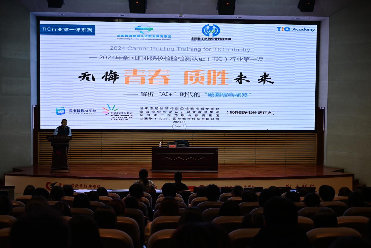 周正火首先分析了时代背景,强调了TIC行业在其中的重要作用。随后,通过一系列生动的案例和数据,对TIC产业链进行了全景式解析,从认证机构、管理体系认证、产品认证到服务认证等各个环节进行了详细介绍,帮助同学们全面了解TIC行业的产业链构成及运作模式,为未来的职业发展奠定了坚实基础。同时,还解析了“AI+”时代下的行业趋势及职业发展机遇,重点介绍了与TIC行业紧密相关的新兴产业,如新一代信息技术、新能源、新材料等,并表示这些新兴产业的发展为TIC行业带来了新的增长点,也为同学们提供了更多的职业选择和发展方向。最后,指出同学们肩负着推动TIC行业高质量发展的重任,要提升专业能力,要注重实践锻炼,要培养创新思维,要坚守职业道德,以无悔的青春书写“质”胜未来的辉煌篇章。