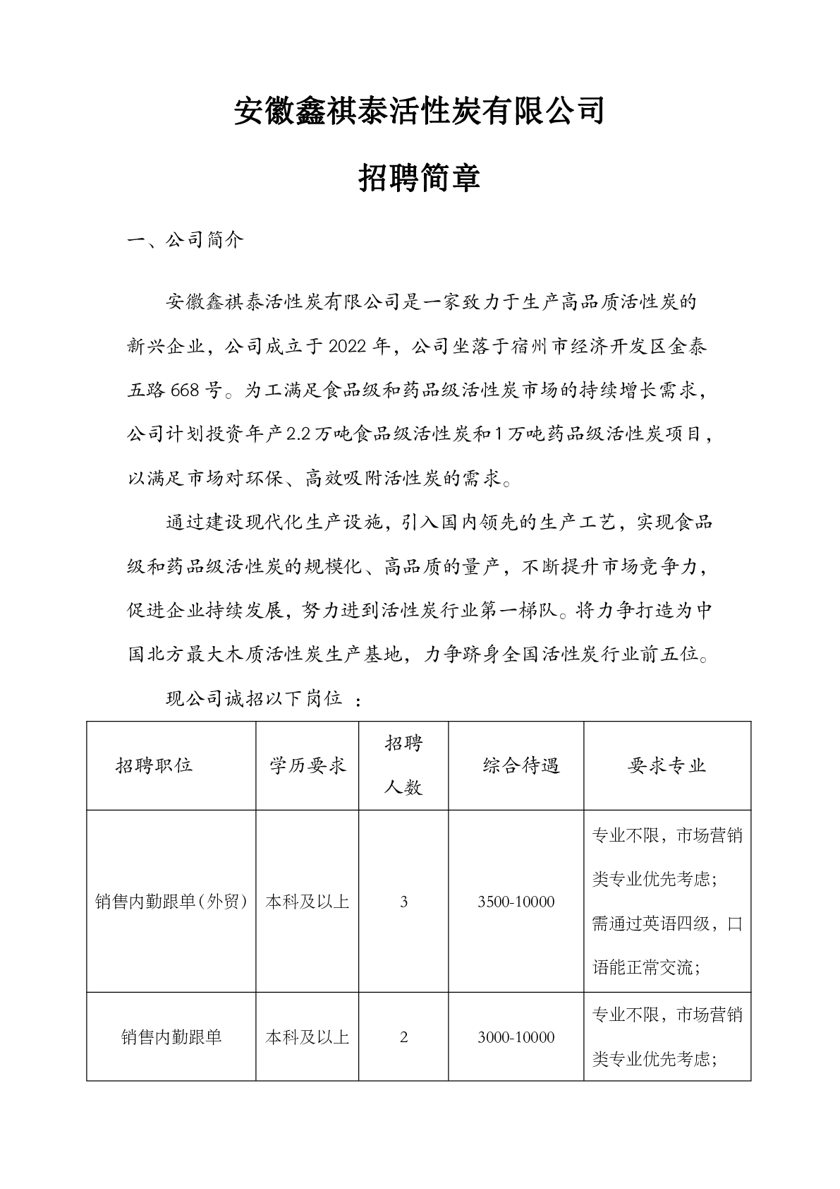 安徽鑫祺泰活性炭有限公司 招聘简章