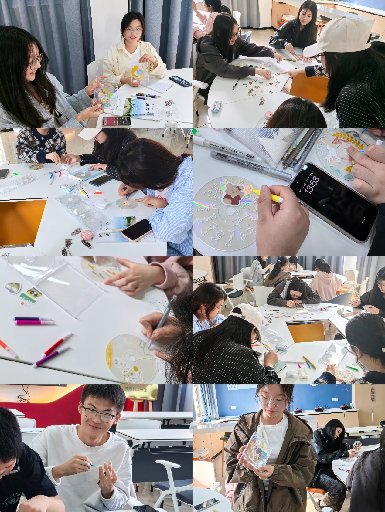 活动以“激发创意、倡导环保、促进交流”为核心,通过光盘设计让参与者感受艺术与可持续生活的融合。现场提供CD光盘、丙烯颜料、贴纸、湿巾等材料,鼓励青年学子自由创作。原本被遗忘的光盘在画笔下焕发新生。大家根据个人创意和喜好,自由选择光盘进行创作,一时间,活动室内充满了思考、讨论与创作的热烈氛围。随着活动的深入,一张张原本单调的CD光盘逐渐变成了色彩斑斓、形态各异的艺术品。