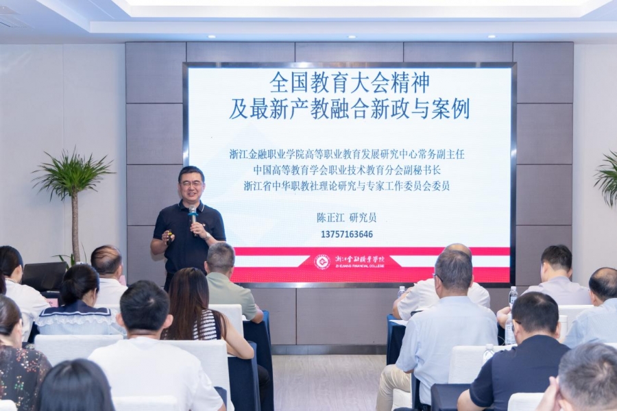 开班仪式后,中国高等教育学会职业技术教育分会副秘书长、浙江金融职业技术学院高教研究中心常务副主任陈正江讲授《全国教育大会精神及最新产教融合新政与案例》开班第一课。