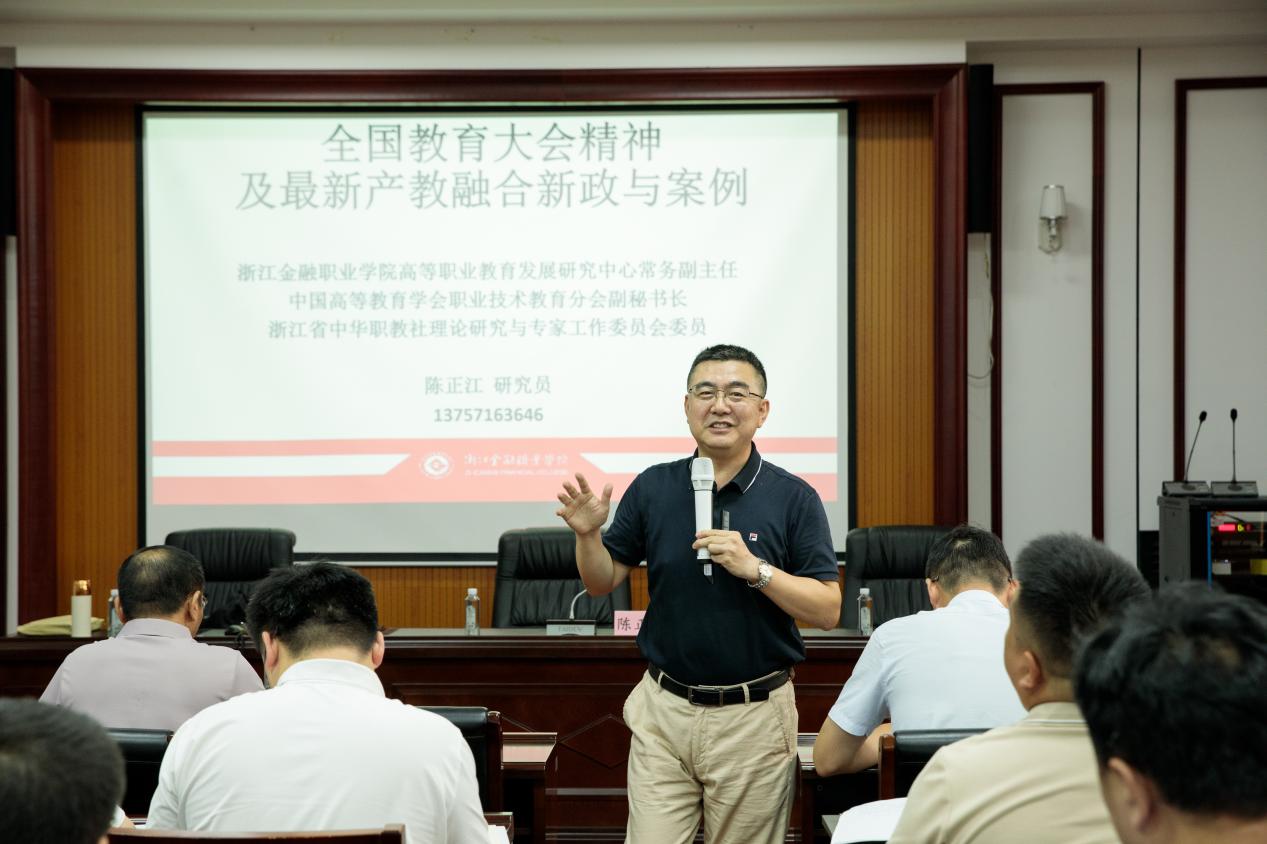 开班仪式后,中国高等教育学会职业技术教育分会副秘书长、浙江金融职业技术学院高教研究中心常务副主任陈正江讲授《全国教育大会精神及最新产教融合新政与案例》开班第一课。