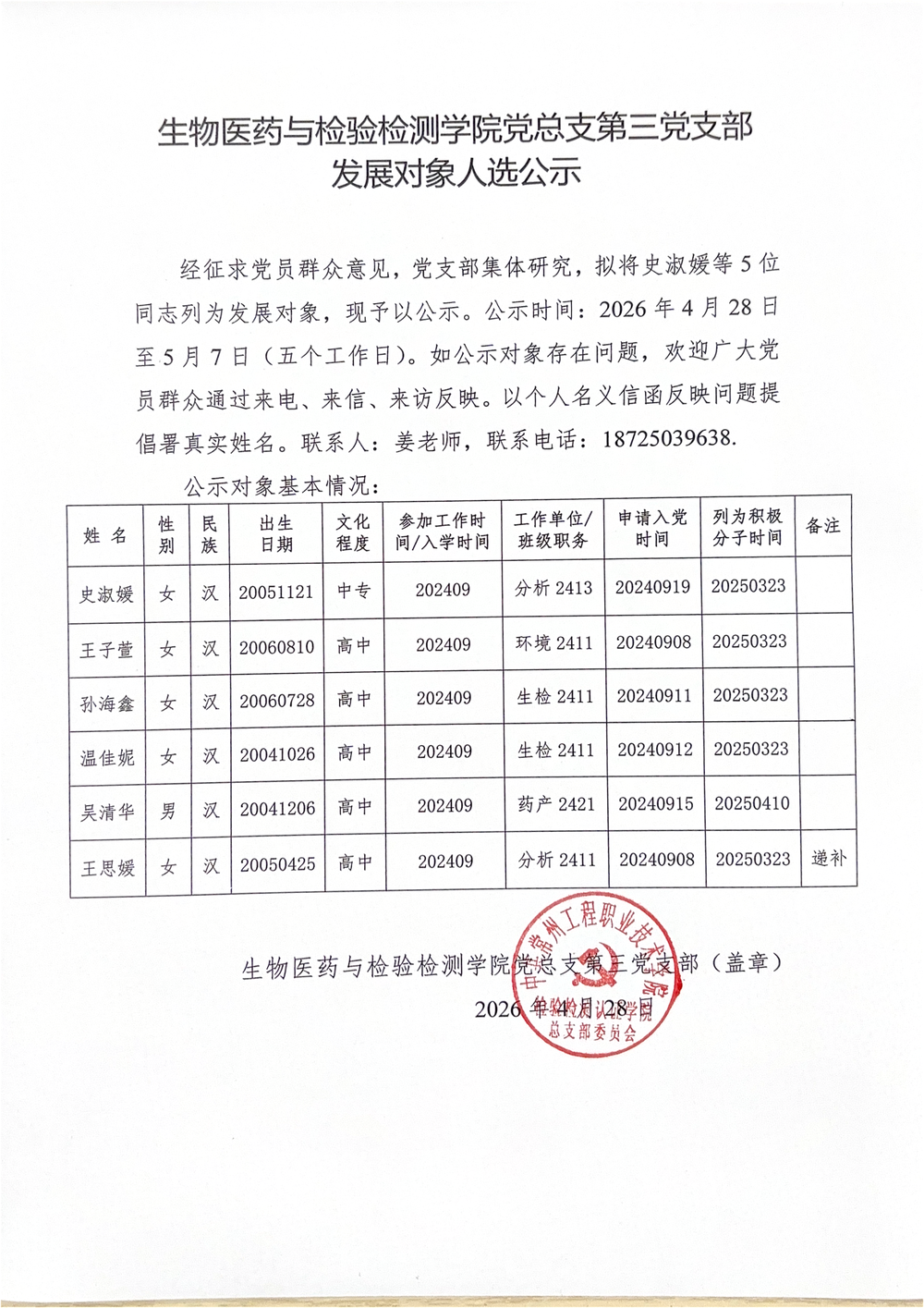 发展对象人选公示20260428